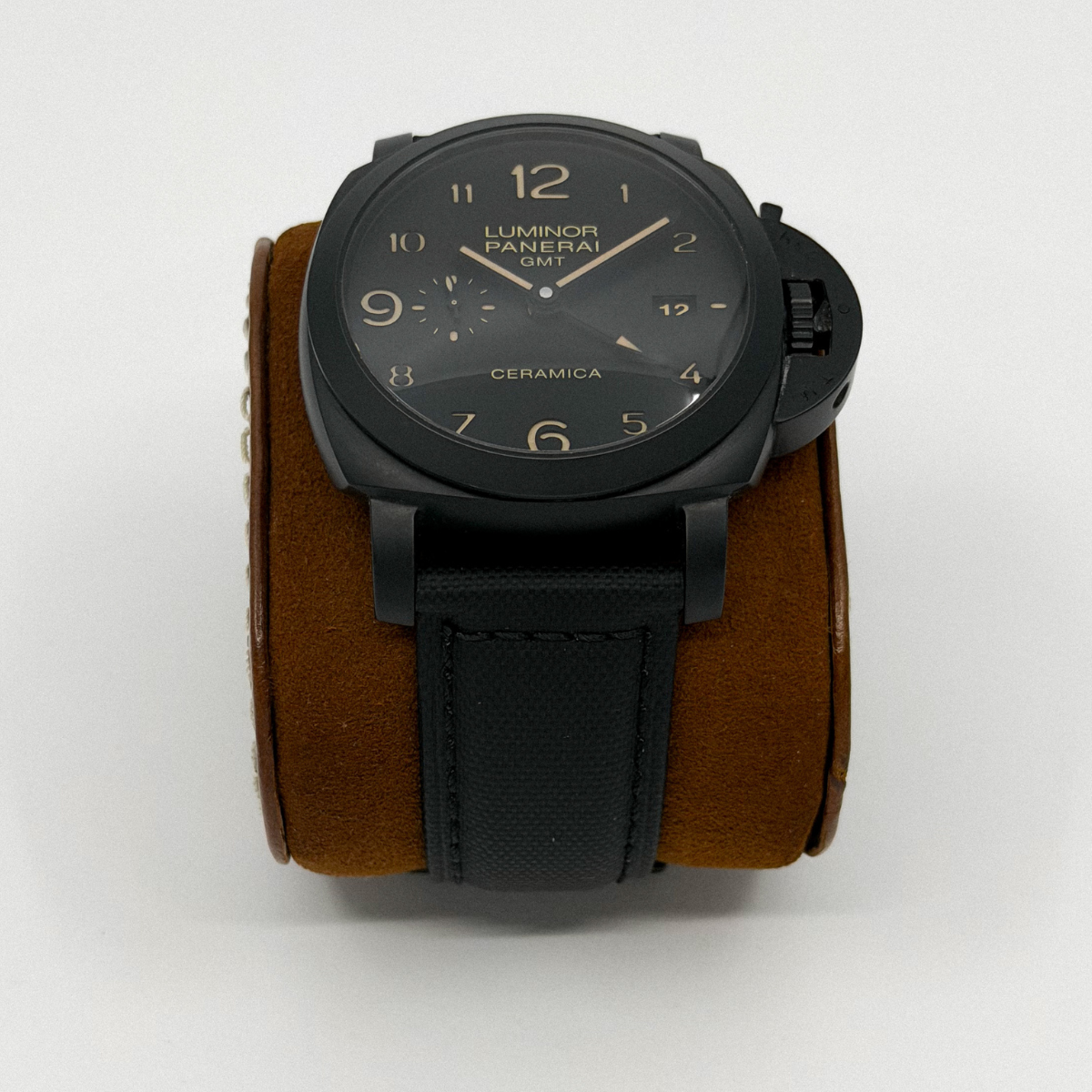 A stealthy ceramic Luminor featuring a 44mm matte black ceramic case with GMT function and 3-day automatic movement. Trades welcome!
